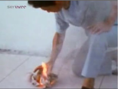 "John Chang deixa a equipe estupefada ao demonstrar seus incríveis poderes, na foto o momento que ele põe fogo num Jornal usando apenas a força da mente."