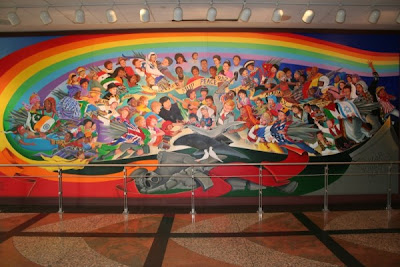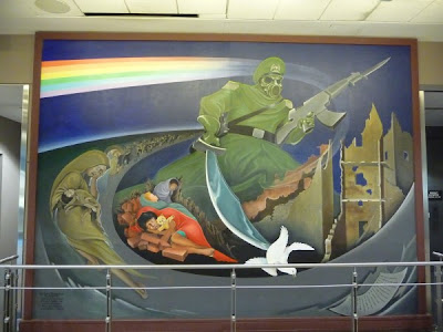 Crianças de todas as cores, vestidas em fantasias folclóricas dão armas embrulhadas em bandeiras de seus países para um.... Garoto. O garoto no centro da imagem, segurando um martelo e aparentemente construindo algo é Alemão. Até mesmo a criança Americana (vestida como boyscout) parece ávida para dar suas armas e a bandeira para o garoto Alemão. Você está no maior aeroporto dos Estados Unidos, e este é o mural que colocam os EUA, alegremente se submetendo à Alemanha? É muito estranho para ser entendido. Isso obviamente representa países do mundo todo entregando seus militares e suas identidades nacionais ao "bem comum".