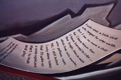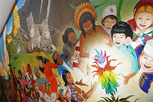 Embaixo da pintura do mural esta uma figura caída segurando um rifle (representando a guerra) com 2 pombos sentados em cima dele (representando a paz). Agora siga o movimento do arco-íris que começa abaixo da estátua, indo ao redor das crianças e levando-nos à parte 2 do mural (que foi repintado recentemente).