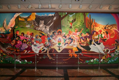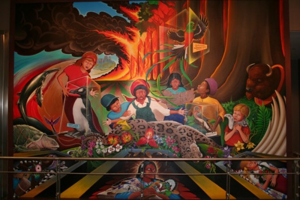 Então o site oficial do aeroporto diz que o nome do mural é chamado "Paz e Harmonia com a Natureza". Sério? No centro da pintura, crianças tristes com animais extintos e espécies de plantas. No fundo, uma floresta pegando fogo e mais para trás, uma cidade pegando fogo.