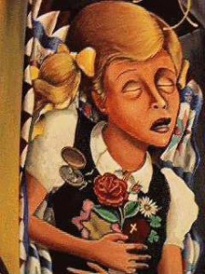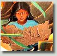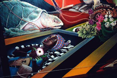 Embaixo, dessa pacífica pintura, podemos ver três caixões abertos com garotas mortas de diferentes culturas. A esquerda esta uma mulher negra e no centro uma india-americana. Por que elas estão deitadas lá com outros animais? Estamos prevendo a extinção destas raças?